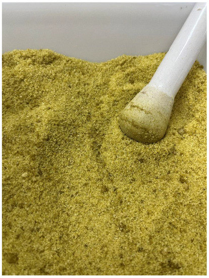 For the formulation, two P. nigrum extraction methods were employed: optimized ASE-150 (Section 3.4) and ultrasound-assisted maceration (UAM). The latter was performed in two 30-min periods with 500 g powdered P. nigrum fruit in 1 L ethanol, with the solvent renewed between periods. The extractive solution was dried by rotary evaporation. Both the ASE-150 and maceration (UAM) extracts were individually diluted in ethanol (10 mg/mL) and were added to crystallized white sugar (10 mL:2 g), transferred to a Petri dish and then completely dried overnight. The resulting solid preparations (Figure 6) were tested in buckets containing 10 L water and 100 Ae. aegypti L3 larvae, in 3 quantities (2, 1 and 0.5 g) corresponding to 10, 5 and 2.5 µg/mL extract, respectively (concentrations >LC90 recommended in the WHO protocol) [30]. Tests were performed in duplicate. Daily mortality was recorded, with viable larvae removed and replaced (100 larvae/bucket).