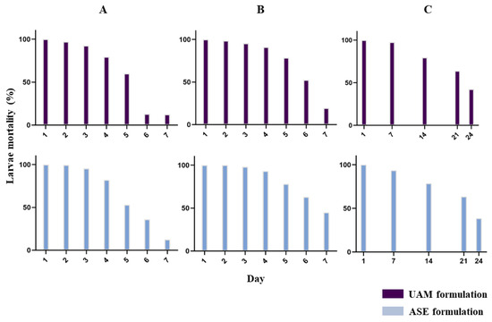 Small-scale simulated field trial of Piper nigrum fruit ethanolic standardized (ASE) and ultrasound assisted maceration (UAM) extract formulations (granulated white sugar) against Aedes aegypti L3 larvae. (A). 2.5 μg/mL. (B). 5 μg/mL. (C). 10 μg/mL.