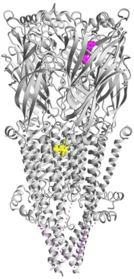 Cryo-EM structure of the human α7 nAChR (pdb:7EKT) showing the intersubunit site for PNU-120596 (yellow), the archetype of type II PAMs, located in the TMD (modified from reference [58]). The ECD binding site for NS-1738 (magenta), a typical type I PAM, was obtained by molecular docking as previously described [31]. Only one of five sites per each PAM is shown for simplicity.
