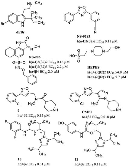 CMPI was discovered by Amgen Inc. through modifications starting from the piperidinamide 9, which had been identified through a high-throughput screening. To increase efficacy and potency, Albrecht and coworkers inserted bioisosters of the amide group such as pyrazole, thiazole, or imidazole. A series of interesting derivatives acting as potent modulators of the rat and human α4β2 receptors were thus obtained, capable of penetrating the CNS in an excellent manner [104]. CMPI was able to discriminate the two stoichiometric combinations of α4β2 receptors. More precisely, CMPI positively modulated LS α4β2 (3:2) but not HS α4β2 (2:3) nAChRs [105,106]. Amgen Inc. also discovered carbamates as α4β2 receptor enhancers starting from a lead compound (10) with an urea function and a stereogenic center. The (R) enantiomer was a moderate potentiator with selectivity for hα4β2 over hα3β2 and hα3β4. Potency and efficacy were improved transforming the urea into carbamate, and changing the substituents on the phenyl ring to give 11, which is an enhancer of the α4β2 receptor [107].