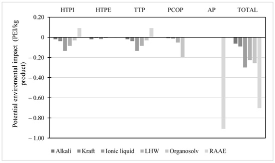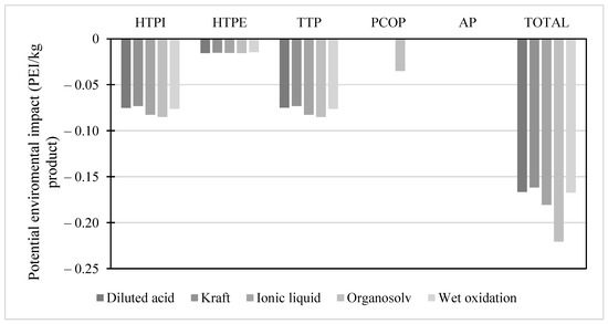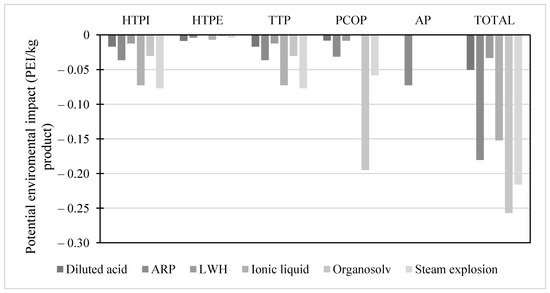 The potential environmental impact of the pretreatment schemes during the isolation of the cellulose fraction is shown in Figure 2. It can be seen that all pretreatments presented similar impacts in the categories analyzed. Therefore, positive environmental impacts were observed, given that their values are negative, interpreted as environmental relief. Additionally, it can be seen that in the photochemical oxidation potential (PCOP) category, the organosolv pretreatment generated less impact because, during pretreatment, there were no considerable emissions of polluting gases, dust, or smoke. Although there could have been impacts related to human toxicity by ingestion (HTPI), there was no negative environmental impact since more than 95% of solvents are recirculated to the process. On the other hand, the RAAE pretreatment is not considered in Figure 2 since its potential presented considerable differences concerning the other pretreatments. The RAAE generated a harmful environmental impact, with 106 PEI kg−1 of product. This impact was reflected in higher rates in the HTPI and terrestrial toxicity potential (TTP) categories since they involve effects on humans either by ingestion, inhalation or dermal exposure to ammonia