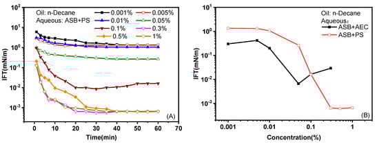 Effect of concentration on dynamic IFTs of ASB@PS (A) and equilibrium IFTs of ASB@PS and ASB@AEC (B) solutions against n-decane.