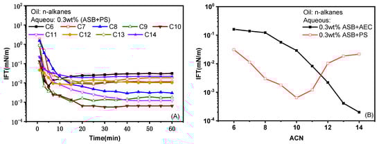 From Figure 2A, it is clear that the dynamic IFT behaviors of ASB@AEC and ASB@PS are similar to that in Figure 1A, showing a typical “L” curve. The equilibrium IFT values of ASB@AEC pass through a minimum with the increase in the alkane carbon number and the nmin value ≥14, indicating that it is very oil-soluble. The nmin value of ASB@PS is 10, which indicates that it is relatively water-soluble. Both of these systems can achieve the ultra-low IFT with n-alkanes with appropriate chain length. As we mentioned above, when the oil is n-decane, ASB@PS shows the best HLB, the IFT value can be reduced to ultra-low, and ASB@AEC only reduce to 10−2 mN/m. However, for the oil C12–C14, ASB@AEC has a better HLB and produces ultra-low IFT values, but the ASB@PS only reduces to 10−2 mN/m.