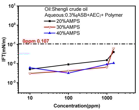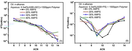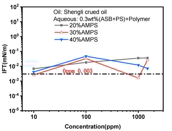 In recent years, with the continuous development of oil fields, high-temperature and high-mineralization reservoirs have gradually become the focus of development. Conventional HPAMs are prone to hydrolyze under high-temperature and high-salt conditions to produce high concentrations of carboxylic acids and complex with calcium and magnesium ions to produce precipitation, resulting in a significant reduction in polymer viscosity, stability, and oil drive performance [31,32]. Therefore, how to inhibit the polymer hydrolysis becomes the key to solve the chemical drive in ultra-high-temperature reservoirs. At present, the hydrolysis of HPAM is primarily inhibited by the introduction of the monomeric 2-acrylamide-2-methylpropanesulfonic acid (AMPS) [33,34,35]. Although a large number of studies have shown that the introduction of AMPS monomer increases the polymer viscosity and provides good stability and performance, which in turn improves the recovery, little has been reported on how it affects the IFT of betaine and anionic and anionic–nonionic complex systems. In this paper, the effect of polymers with different AMPS monomer contents on the IFT of betaine complexing (ASB@AEC, ASB@PS) solutions against n-alkanes and Shengli crude oil are investigated. The related results have important guiding significance for the design of enhanced recovery formulations in high-temperature and high-salt reservoirs.