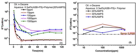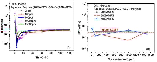 The effect of polymer on the dynamic IFTs curve of different complex systems is different, which may show an “L” shape when decreasing to the plateau value and a “V” shape when passing the lowest value with time [39,40,41]. In order to further understand the effect of AMPS monomer polymer on the dynamic IFTs of surfactant solution, the dynamic IFTs between polymer with different concentrations and 0.3 wt% ASB@AEC/ASB@PS solutions against n-decane were studied.
