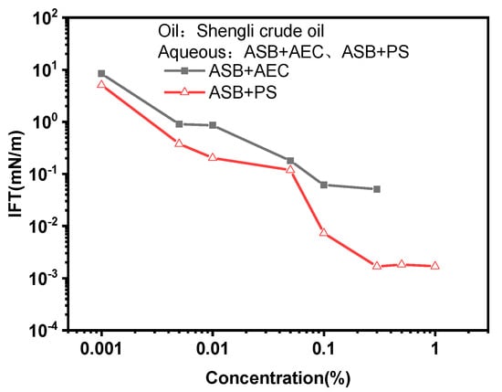 Crude oil contains very complex substances, among which many naturally active substances may act synergistically with surfactants to reduce the IFT between surfactants and crude oil [42,43]. Petroleum acids, such as asphaltenes or naphthenic acids, adsorb to the oil–water interface and solid–oil interface, and affect the interfacial tension, emulsification, and three-phase contact angle of chemical flooding [44,45,46,47]. To further investigate the synergistic effect in the two mixed systems, ASB@AEC and ASB@PS, we studied the IFTs between the mixed systems and crude oil. In this work, the dynamic IFT behaviors of all the mixed solutions against crude oil are similar to those against decane. For brevity, no dynamic data plots are listed.