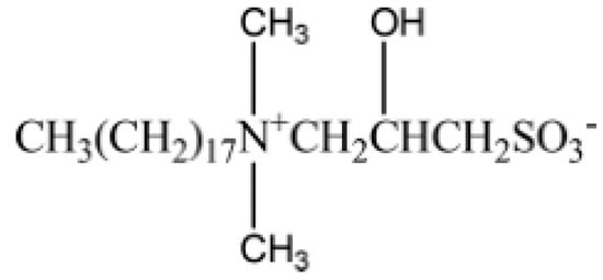 The ASB@AEC (cetylsulfonbetaine + tetrainyl EO3 carboxylate) and ASB@PS (cetylsulfonbetaine + Shengli Petroleum sulfonate with an average molecular weight of 320) used in this study were provided by Shengli Oil Field (Dongying, Shandong, China). The ASB structure is shown in Scheme 1. Three kinds of polymers were obtained from Shengli Oil Field, China: low-hydrolysis new type III 1#, AMPS 20 wt%, hydrolysis degree 0, molecular weight 20.1 million; low hydrolyzed new type III 2#, AMPS 30 wt%, hydrolysis degree 0, molecular weight 19.5 million; low hydrolyzed new type III 3#, AMPS 40 wt%, hydrolysis degree 0, molecular weight 20.5 million. Alkane (>99 mol %) chain length C6–C14. The crude oil comes from Shengli Oil Field, and its density is 0.9157 g/cm3 at 80 °C. All inorganic reagents used (NaCl, NaHCO3, CaCl2, MgCl2) were of analytical grade, which purchased from Macklin Reagent Co., Shanghai, China. The simulated formation water was prepared with distilled water, whose composition is shown in Table 1. The pH values of simulated formation water, surfactant solution, and surfactant–polymer solution are shown in Table 2. The viscosity values of the surfactant–polymer solutions are shown in Table 3.