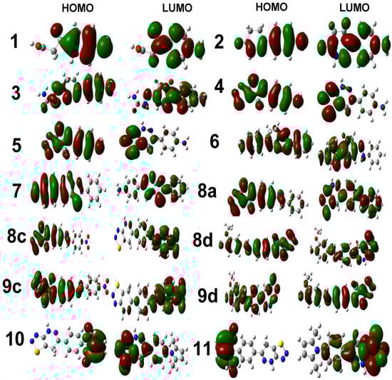3D plots of the molecular orbitals of HOMO and LUMO of compounds calculated using the DFT (B3LYP)/6-31G+(d) method.