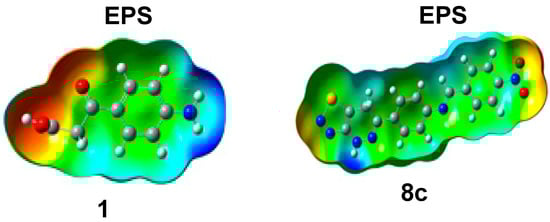 The molecular electrostatic potential (MEP) is an important parameter for predicting and understanding the molecular shape, electron density, relative polarity, and molecular interaction of electrophilic-nucleophilic sites. Thus. to predict the chemically reactive sites required for the electrophilic and nucleophilic attacks of molecules 1 and 8c. MESP plots were calculated using the B3LYP/6-31+G(d) model and the DFT method for the optimized structure already obtained (Scheme 4). In this context. Electrostatic potential values are identified by different colors on the surface; the red region is related to the lowest or most negative electrostatic potential. The blue region identifies the highest or most positive electrostatic potential, and the green region refers to the area of zero potential. Therefore, the electrostatic potential rises in the order red < orange < yellow < green < blue.