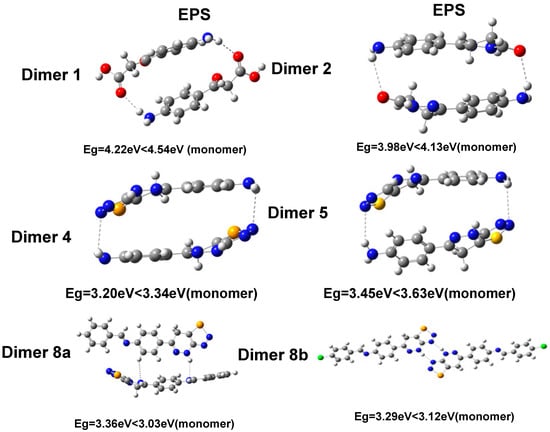 As illustrated in Scheme 5, the gap energy value is reduced for the dimer as compared to the monomer for each structure. As an example, compound 1 Eg decreases from 4.54 eV (monomer) to 4.22 eV (dimer). This is a sign of the highest chemical reactivity and the lowest kinetic stability for a longer chain, as referred to in [38]. Moreover. in the case of component 8. selenium plays a good role in increasing the chemical reactivity compared to the other components. Thus, for the dimer of sample 8, the existence of two selenium atoms will further increase its chemical reactivity. Furthermore, this decrease in the energy gap value is due to the intermolecular interaction that can arise between the two monomers, such as hydrogen bonding interaction [39]. Thus, DFT represents a pertinent theory for predicting the chemical reactivity of the studied component.