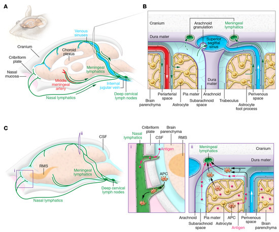 The cervical lymph nodes through the CNS’s lymphatic and lymphatic drainage pathways. (A) The meningeal lymphatic vascular system is depicted schematically in the mouse brain. Along with the venous sinuses, arteries, and cranial nerves, the dural lymphatic vessels leave the cranium through the foramina in alignment with the dural blood vessels and cranial nerves. Along with the olfactory nerves, certain lymphatic veins may be seen crisscrossing the cribriform plate. Tracers injected into the SAS or brain parenchyma drain into the dcLNs adjacent to the jugular vein through the dural lymphatic arteries. (B) ISF and CSF circulation up close. CSF and solutes are transported into the brain via the perivascular glymphatic drainage system through the periarterial pathway, whereas ISF and solutes are transported out of the brain by the perivenous glymphatic pathway. CSF macromolecules and immune cells are mostly carried by the dural lymphatic channels into the lymph nodes and extracranial systemic circulation, and CSF can reach the venous system via arachnoid granulations. (C) Routes for antigens and antigen-presenting cells to exit the central nervous system (APCs). Dendritic cells, in particular, may migrate along the rostral migratory stream (RMS) to enter the lymphatics via the olfactory bulb’s SAS. Alternatively, antigens and APCs are proposed to leave the CNS via the glymphatic pathway (as demonstrated for antigens), reaching the SAS and entering the meningeal lymphatic vasculature via SAS and trafficking to the dcLNs. APCs in the meningeal spaces may also go to the dcLNs through meningeal lymphatic channels. It is still unknown how much each mechanism contributes to cell and antigen outflow. Reproduced with permission from [47].