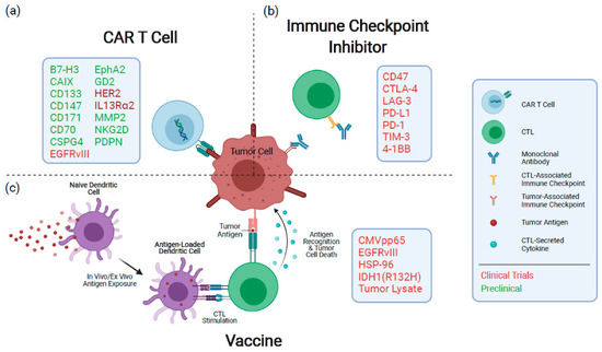 An overview of the immunotherapeutic techniques currently under investigation for the treatment of GBM. (a) CAR T cells identify antigens via a genetically designed extracellular receptor that, following antigen binding, induces intracellular T cell activation and degranulation. (b) Immunological checkpoint protein inhibitors limit the dampening of immune responses during activation and exhaustion. (c) Vaccines expose antigen-presenting cells to tumor antigens, inducing an immune response specific to the target antigens. Therapeutic targets or mediators being pursued for each modality are denoted in the boxes. CAR: chimeric antigen receptor; CTL: cytotoxic T cell. Reproduced with permission from [191].