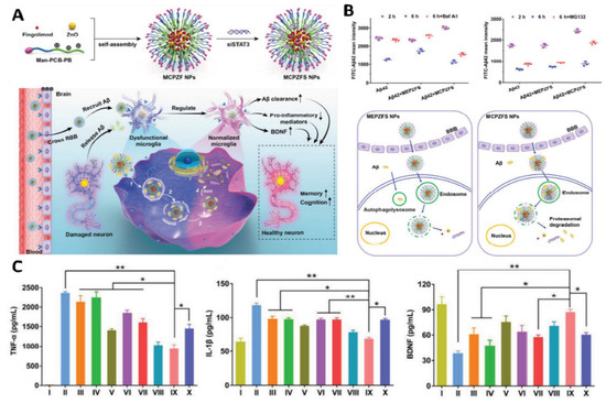 Immune-modulating effect of a PCB-based zwitterionic nanoparticle for AD therapy. (A) MCPZFS NPs for AD therapy: structure, preparation, and mechanism. MCPZFS NPs can penetrate the BBB and endocytose into microglia cells to normalized malfunctioning microglia. Pro-inflammatory mediators were reduced. Microglia’s phagocytic capacity was restored when BDNF production rose. The injured neuron is then healed in numerous ways. (1) NPs endocytosed amyloid-β into microglia. (2) After perturbing the endosome/lysosome membrane, NPs leaked into the cytoplasm. (4) Finally, ROS-mediated release of fingolimod, siSTAT3, ZnO, and amyloid-β. (B) The effect of NPs on microglial phagocytosis and Aβ degradation after 2 h co-incubation with FITC-A42 and NPs. Flow cytometry was utilized to detect the degradation of A42 of BV2 in BafA1 or MG132 (top right) and the phagocytosis and degradation behavior mediated by MEPZFS NPs and MCPZFS NPs. (C) Representing the effect of NPs on the inflammatory regulation of microglia via the ELISA method was applied to determine the levels of TNF-α, IL-1β, and BDNF in the supernatants. Samples: (I) PBS, II) Aβ42, (III) Aβ42 + fingolimod, (IV) Aβ42 + siSTAT3, (V) Aβ42 + CPFS, (VI) Aβ42 + CPZS, (VII) Aβ42 + CPZF-siNC, (VIII) Aβ42 + CPZFS, (IX) Aβ42 + MCPZFS, and (X) Aβ42 + MEPZFS. Copyright, 2019, Wiley and Sons IncReproduced with permission from [265]. * p < 0.05, ** p < 0.01.