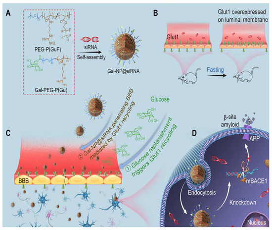 Illustration of glycosylated “triple-interaction” stabilized siRNA nanomedicine (Gal-NP@siRNA) and strategy of treating AD pathology in APP/PS1 transgenic mice. (A) Schematic of Gal NP@siRNA manufacturing. (B,C) How Gal-NP@siRNA enters the brain and accumulates. 24 h fasting increases BBB luminal Glut1 expression. After treatment with Gal-NP@siRNA, glucose replenishment in fasting mice leads to Glut1 recycling from the BBB luminal to the abluminal membrane. (D) Gal-NP@siRNA-mediated BACE1 mRNA knockdown reduces amyloid plaques. Adapted with permission from [266].