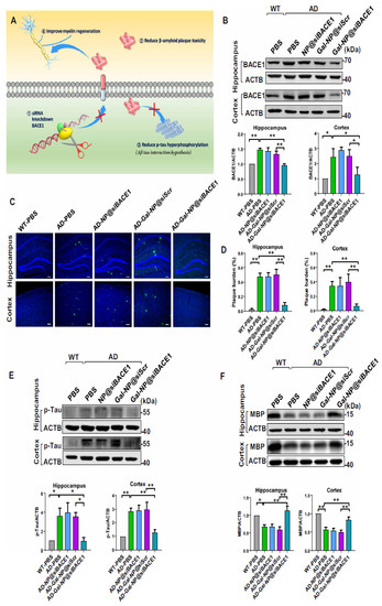 Gal-NP@siBACE1 treatment modulates AD hallmarks in APP/PS1 mice. (A) A mechanism for siBACE1′s actions. (B) BACE1 protein expression in the hippocampus and cortex of nanocarrier-treated APP/PS1 mice, control APP/PS1 groups, and WT mice. BACE1 expression was quantified relative to actin (n = 3, mean ± SEM, * p < 0.05, ** p < 0.01). CLSM imaging data to assess amyloid plaque load. A plaque (green) in APP/PS1 transgenic and WT mice hippocampus and cortex. DAPI staining nuclei (blue), 100 µm scale bars. (C) Representative confocal laser scanning microscopy (CLSM) imaging data are assessing the amyloid plaque burden. Immunofluorescence of Aβ plaques (green) in the hippocampus and cortex from APP/PS1 transgenic and WT mice. Nuclei were stained by DAPI (blue). Scale bars, 100 µm. (D) Amyloid plaques were measured in the hippocampus (left) and cortex [181] (n = 4, ** p < 0.01; mean ± SEM). (E) p-tau and (F) MBP expression in the hippocampus and cortex for nanocarrier-treated APP/PS1 mice, control APP/PS1 groups, and WT mice (top). Quantification of Western blotting analysis was relative to β-actin (bottom) (n = 3, mean with SEM, * p < 0.05, ** p < 0.01). All samples were collected after 10 administrations of nanomedicine. Adapted with permission from [266].