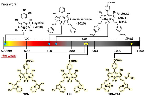 Boron-dipyrromethene (BODIPY) is a fused nitrogen- and boron-containing heterocyclic fluorophore core that is known for bright emission in the visible and NIR regions [12,13,14,15,16]. When compared to cyanines and xanthenes, few BODIPY dyes emit in the SWIR [17,18,19,20,21]. Tuning electron donating groups on a BODIPY scaffold can potentially produce bright NIR/SWIR dyes. Indolizine is a fused nitrogen-based heterocycle that displays exceptional electron donating ability due to its planarity, full-conjugation, and proaromaticity in the donated configuration [22]. Our group has recently reported squaraines [23,24], cyanines [25,26], and xanthenes [18,27] equipped with indolizine donors to replace common amine and indoline donors, which significantly shifted the parent chromophores to longer emission wavelengths. Thus, we aimed to do the same with a classic BODIPY scaffold to embark on a fundamental chromophore design study similar to our previous publications on cyanines and squaraines [23,25]. These fundamental studies are critical to designing desirable chromophore properties and synthetic routes to these systems before synthetically complicating water solubilizing functionality is installed for biological imaging purposes. Additionally, according to the literature, meso-C BODIPY dyes (where a carbon is located at the middle, or meso, position in the BODIPY core) seem to rely heavily on extended conjugation, as well as donation strength, to access longer wavelengths. Installing styryl substituents on a tetramethyl BODIPY bathochromically shifts the λmaxemis by 0.64 eV (186 nm shift from 514 nm to 700 nm; Figure 1) [28,29]. However, exchanging the phenyl substituents (no donors) with dimethylanilines (strong donors) minimally affects the λmaxemis (700 vs. 737 nm) [12]. Herein, we show that using an indolizine donor in place of the dimethyl aniline donor produces a significant bathochromic shift of the λmaxemis by 0.26 eV (135 nm shift from 737 nm to 872 nm) in the meso-C BODIPY scaffold that is well into the NIR region.