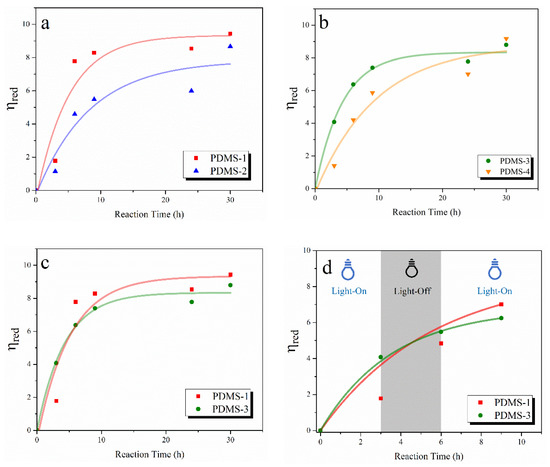 Reduced viscosity over reaction time graphs of (a) PDMS-1 and PDMS-2 (b) PDMS-3 and PDMS-4 (c) PDMS-1 and PDMS-3 (d) PDMS-1 and PDMS-3.