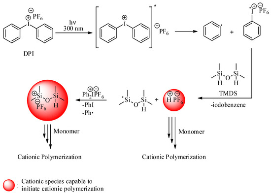 - Wang, D.; Szillat, F.; Fouassier, J.P.; Lalevée, J. Remarkable versatility of silane/iodonium salt as redox free radical, cationic, and photopolymerization initiators. Macromolecules 2019, 52, 5638–5645. [Google Scholar] [CrossRef]