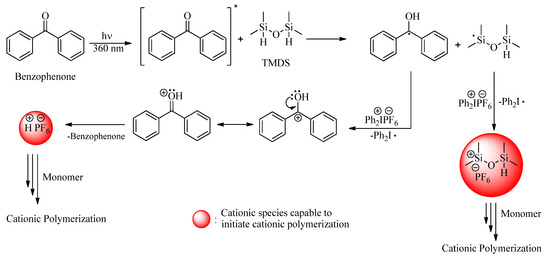 In this work, the photoinitiated cationic ROP of D4 by direct and indirect activation mechanisms was investigated. Benzophenone and pyrene acted as photosensitizers (PS) in the presence of diphenyliodonium (DPI) salt in indirect activation. As will be shown below, photochemically generated acids and silylium cations were electrophilic enough to induce the cationic polymerization [38,39,40].
