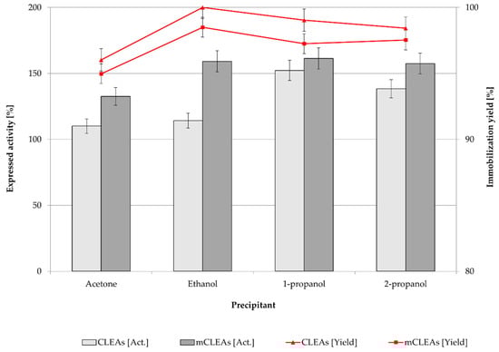 Relative activity (%) and immobilization yield (%) for CLEAs and mCLEAs using 1-propanol as precipitating agent.