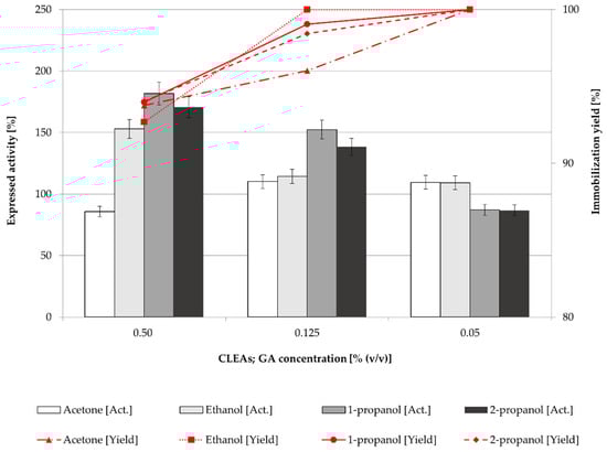 In general, the expressed activity of CLEAs or mCLEAs appeared to be highly dependant on the cross-linker concentration. Concentration of cross-linker is of key importance in CLEAs and mCLEAs preparation, as it influences the activity and stability of CLEAs and mCLEAs, as well as particle sizes. Different concentrations (0.50% (w/w), 0.125% (w/w), and 0.05% (w/w)) were applied and the expressed activity of CLEAs and mCLEAs as well as immobilization yield were determined. In Figure 2, the results suggest that the best precipitation reagent for CLEAs when using GA as a cross-linker in concentrations of 0.50% (w/w) and 0.125% (w/w) was 1-propanol, which gave 180.71% (17.87 µmol/min mL) of cellulase CLEAs expressed activity when using 0.50% (w/w) of GA. This is even higher than that observed in the previous experiment (Figure 1), in which 151.34% (14.97 µmol/min mL) of expressed activity was reported when using 0.125% (w/w) of GA.