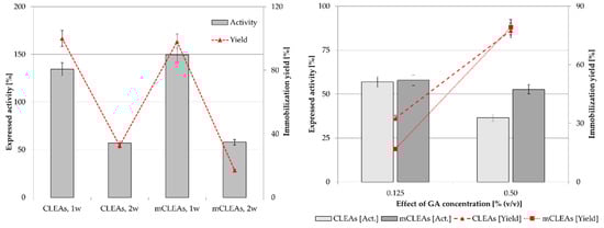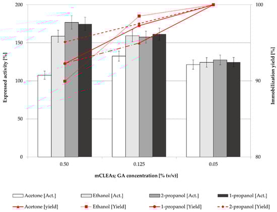 The highest GA concentration also gave the highest CLEAs activity even though the immobilization yield was the lowest. The same trend could be observed for mCLEAs preparation (Figure 3). The differences in immobilization yield are not significant, ranging from 90% to 100%; however, there are significant differences in expressed activities. At lower cross-linker concentrations, insufficient cross-linking occurred, which resulted in unstable CLEAs and mCLEAs releasing the enzyme into the reaction media.