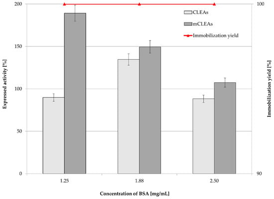 Influence of BSA concentration on CLEAs and mCLEAs expressed activity and immobilization yield (100% expressed activity equals initial activity 9.89 µmol/min mL).