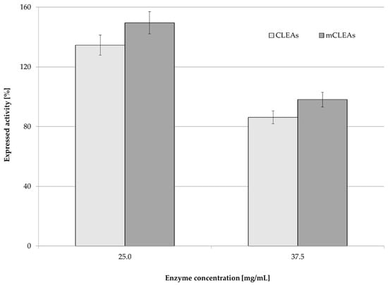 Not surprisingly, by increasing the concentration of cellulase from 25.0 mg/mL to 37.5 mg/mL in CLEAs and mCLEAs, their activity decrease was observed (Figure 5). It was reported that the enzyme concentration influenced the amount and particle size of CLEAs [78]. Every enzyme has a unique structure, and the optimum activity was obtained at a certain shape and size of particles. Increasing enzyme concentration can lead to diffusional limitations and the loss of activity, when enzyme aggregates are packed together [79]. Excessive protein may result in compact aggregates, which can lead to a loss of flexibility. It can also hinder active sites of the enzyme from attaching to the substrate. Similar results were also observed in previous studies [80]. Immobilization yield was 100% for both CLEAs and mCLEAs with 0.125% (w/w) GA at 25 °C. When the concentration of the enzyme in CLEAs and mCLEAs was 25 mg/mL, the expressed activity was 112.14% (11.09 µmol/min mL) for CLEAs and 148.29% (14.67 µmol/min mL) for mCLEAs. With the increase in enzyme concentration, the expressed activity decreased below 100% and was 84.22% (8.33 µmol/min mL) for CLEAs and 97.10% (9.60 µmol/min mL) for mCLEAs. It can be assumed that the enzyme immobilization already reached its maximum and that the surface of the nano-carrier became saturated with the enzyme. The aggregation of the enzyme, which makes some active sites of the enzyme hidden, may also be the cause for a decrease in activity at higher enzyme concentrations. The same effect was already confirmed with our previous studies [75] and also observed by Eldin et al., where higher enzyme concentrations caused the increase in density of the immobilized enzyme molecules on the particles’ surface. Such an occurrence later led to higher protein-to-protein interactions, which caused the reduction in catalytic activity [81]. Immobilization yield was 100% for both CLEAs and mCLEAs with 0.125% (w/w) GA, at 25 °C. When the concentration of the enzyme in CLEAs and mCLEAs was 25 mg/mL, the expressed activity was 134.57% (11.09 µmol/min mL) for CLEAs and 148.29% (14.67 µmol/min mL) for mCLEAs. With the increase in enzyme concentration, the expressed activity decreased and was 84.22% (8.33 µmol/min mL) for CLEAs and 97.10% (9.60 µmol/min mL) for mCLEAs.
