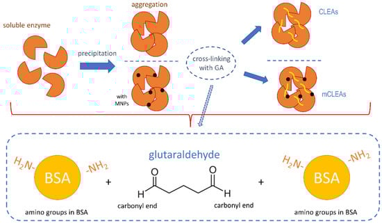 Schematic mechanism of cross-linking with GA in CLEAs and mCLEAs synthesis.