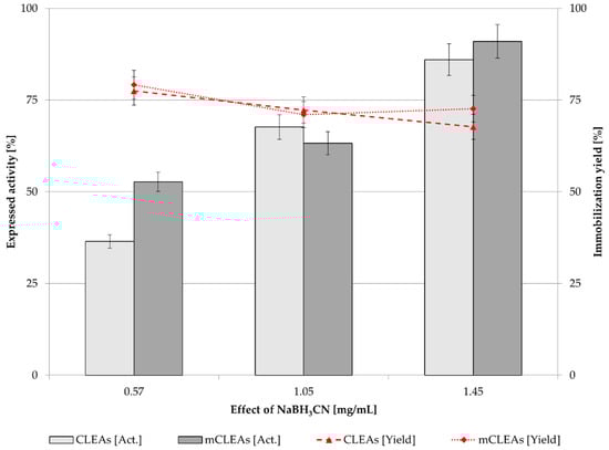 NaBH3CN is used as a reducing agent in the cross-linking synthesis that can convert imines to amines. It reduces the unsaturated Schiff’s base to form irreversible linkages [88]. Increasing the concentration of NaBH3CN in CLEAs and mCLEAs to 1.45 mg/mL significantly increased their activity. For CLEAs, the expressed activity increased by 50.08% (from 35.49% to 85.57%), and for mCLEAs, the expressed activity increased by 38.56% (from 53.79% to 92.35%), as can be seen in Figure 8. It is assumed that there are approx. 12% more unsaturated linkages of Schiff’s bases in CLEAs than in mCLEAs, where the amino functionalized MNPs decreased the number of unsaturated linkages.