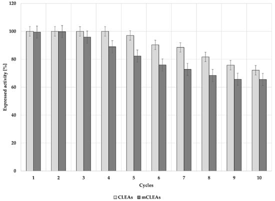 The benefit of using proteic feeder BSA was also reported in a study by Shah et al. [39] and Cruz et al. [37], which is in accordance with our results. The use of proteic feeder is necessary to obtain actual cross-linking of enzyme molecules, while having low density of lysine in its surface. Therefore, BSA may be a good choice as a proteic feeder, as it is a molecule with amino groups on its surface and allows easy cross-linking using GA. Hence, having BSA in the synthesis of CLEAs and mCLEAs leads to extensive cross-linking with high hydrolytic activity. The increase in activity in CLEAs and mCLEAs formation was also observed in previous works, where Galvis et al. reported on increased activities while using BSA in CLEAs [77]. The differences in expressed activities can be attributed to different sizes of particles as well as in different sizes of internal pores, which can modify the diffusion of substrates.
