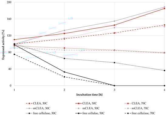 As many industrial processes run at elevated temperatures for longer periods of time, such processes require thermally stable enzymes. Many industrial enzymes must withstand higher temperatures during different bioprocesses. For cellulosic bioprocesses, used enzymes must endure temperatures usually around 50 °C for up to 72 h. The stability of CLEAs and mCLEAs at 30 °C, 50 °C, and 70 °C was determined. CLEAs and mCLEAs were prepared with an enzyme concentration of 25 mg/mL, using 1-propanol as the precipitating reagent and a cross-linking time of 3 h. The concentration of GA was 0.125% (w/w) and the concentration of NaBH3CN was 1.45 mg/mL. The concentration of BSA was 1.88 mg/mL for CLEA and 1.25 mg/mL for mCLEA. Both CLEAs and mCLEAs were incubated at each temperature for 4 h in order to determine their stability. The activity of CLEAs and mCLEAs increased significantly in comparison with the activity of free enzyme after 4 h of incubation at each temperature. When incubating CLEAs at 30 °C for 4 h, their activity increased by 45.65%, resulting in 145.65% of its initial activity. Similar results were obtained after incubation of mCLEAs at 30 °C, where after 4 h the activity of mCLEAs increased for 88.7%. The increase in the immobilized cellulase activity is probably attributed to the cross-linking of enzyme molecules that kept the conformational integrity and thus the catalytic activity [93] as can be seen in Figure 10. When incubating CLEAs and mCLEAs at 50 °C, their activity still increased after 4 h, resulting in 185.1% and 141.4%, respectively. An additional thermal stability test was performed at 70 °C, where the activity of CLEAs and mCLEAs decreased slightly, but still retained 79.1% and 78.1%, respectively. For comparison, the thermal stability of free cellulase was investigated as well. Free cellulase retained only 36.3% of its initial activity after 4 h, whereas at incubation at 50 °C and 70 °C the free cellulase was inactive after 4 h of incubation. The results suggest that immobilized CLEAs and mCLEAs of cellulase show good thermal stability compared with free cellulase at specific temperatures. Our results are consistent with other studies, where the temperature for the highest activity of free cellulase was at 50 °C and shifted to 60 °C for mCLEAs [87]. Such results may be a result of immobilization scaffold occurring, which can prevent the stretching of enzyme molecules at elevated temperatures.