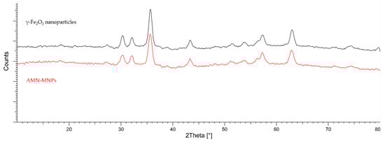 Surface characterization of synthesized AMN-MNPs was published in our previous research by Leitgeb et al. and can be found in [97]. The XRD spectra provide information about the crystalline structure of synthesized MNPs, as well as their degree of structural order. Figure 11 shows the XRD patterns of coated AMN-MNPs and bare γ-Fe2O3 nanoparticles. Diffraction peaks obtained for AMN-MNPs and bare γ-Fe2O3 nanoparticles are in correlation with the simulated diffractogram for maghemite, displaying the formation of the iron oxide phase, which shows that further surface functionalization with aminosilane maintained its crystalline structure. The values of the particles’ sizes, calculated using Scherrer’s equation, are given in Table 3.