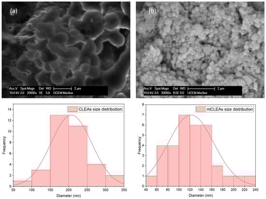 SEM images of (a) CLEAs and (b) mCLEAs with their corresponding particle size distributions.