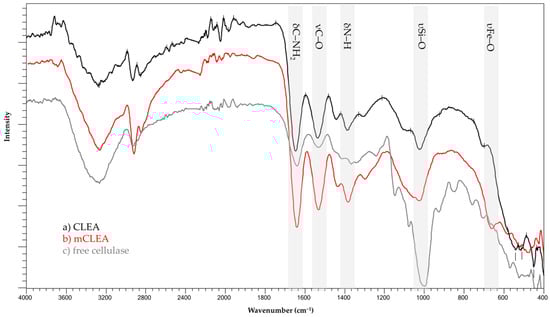 FT-IR spectra of CLEAs, mCLEAs, and free cellulase.