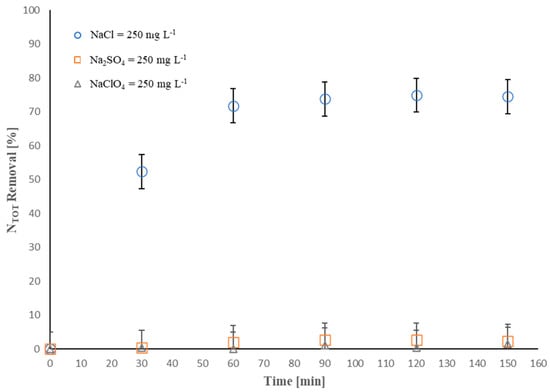 Furthermore, it is worth noting that, when Na2SO4 and NaClO4 were used, no NTOT removal was basically achieved at the end of the process. The high removal efficiency gained in the presence of NaCl proves that around 75% of NTOT, initially present in the solution as NH4Cl, was removed after 150 min. As reported in a previous study by Mandal et al. [35], the presence of chloride in the solution promotes a very effective electroremoval process of NH4+-NH3.