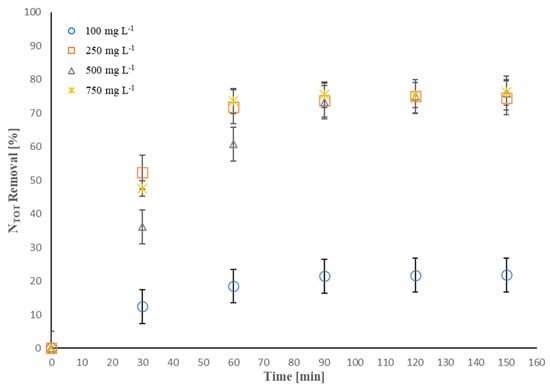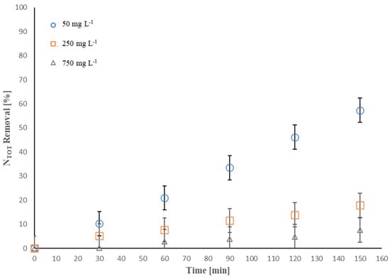 Considering the findings reported above, it was decided to examine the effect of the latter factor, in the range of 50–750 mg·L−1, on the NTOT removal efficiency. Figure 4 clearly displays that, upon enhancing the concentration of ammonium initially present in the solution, the NTOT removal efficiency decreased.