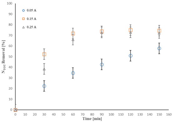 NTOT removal efficiency of 57.8% was obtained operating with the lowest applied current intensity of 0.05 A after 150 min of treatment, despite the linear increase observed. A rise in the current intensity to 0.15 A resulted in an improvement of NTOT removal of 74.5% after a treatment time of 90 min; after that, the removal efficiency was constant. A further increase to 0.25 A led to no enhancement of the efficiency, showing a reduction in the removal efficiency at about 72% after 150 min.