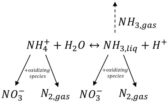The electrochemical degradation mechanism of nitrogen compounds can be assumed to be a series–parallel reaction system with a first step in which ammonium ions and ammonia are in equilibrium. Then, nitrogen oxidation occurs, forming NO3− and N2; however, the main product of nitrogen oxidation is N2, while ammonia stripping is about zero.