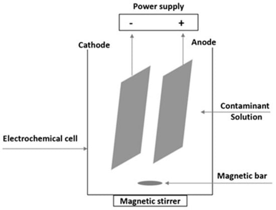 A bench-top direct current power supply BPS-305 (Lavolta, London, UK) was connected to the BBD electrodes, enabling it to operate in amperostatic conditions. Figure 7 shows a schematization of the electrochemical reactor.