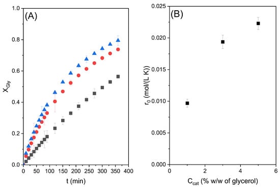To study this variable, three experiments were carried out at 80 °C, using a molar excess of ethylene carbonate to glycerol (reagent molar ratio equal to two) and setting the catalyst concentration at values 1, 2, and 3% w/w of glycerol.