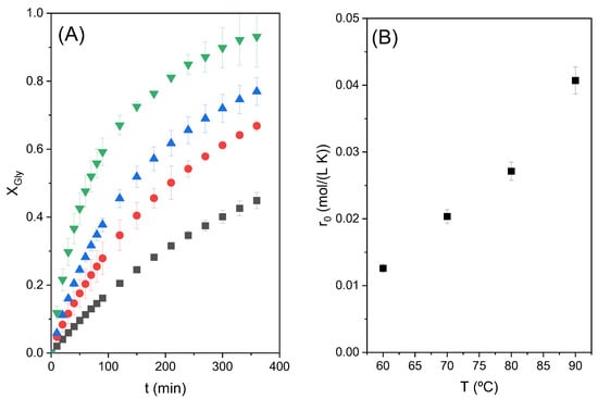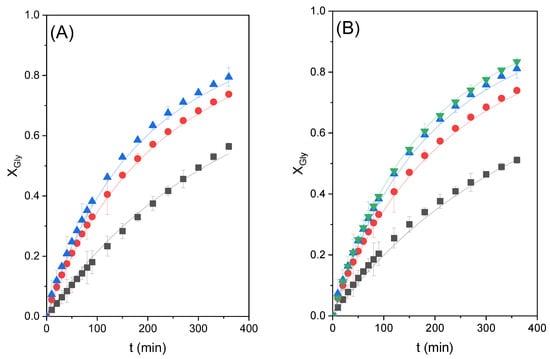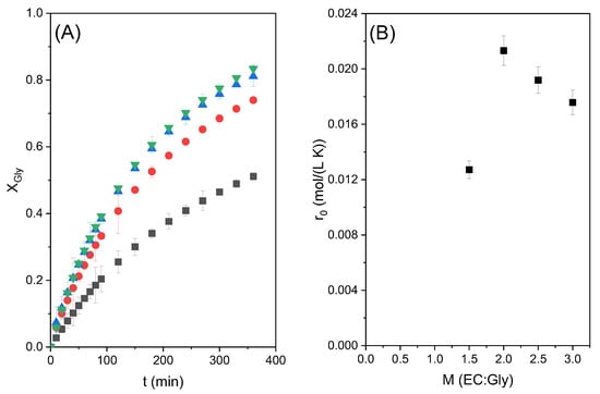 Figure 4A shows the conversion of glycerol with time obtained in these runs. The maximum conversion of around 77% was obtained at 6 h of reaction time with the highest molar ratio studied, as expected when the reaction is shifted towards the products by a high excess of ethylene carbonate; however, it can be observed that, at short times, the fastest reaction occurs when the CE/Gly molar ratio is equal to 2. This suggests that a big excess of carbonate means excessive dilution of glycerol, negatively affecting the global reaction rate. This observation can be better appreciated in