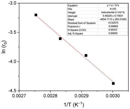 0) with the inverse of the absolute temperature 1/T; a linear tendency can be appreciated. The slope of the line is used to determine an approximate activation energy of the studied reaction, obtaining a value of 37.35 kJ/mol. This value of activation energy is within the range of expected values, taking into account what is reported in the literature. Devi et al. obtained an activation energy of 39.2 kJ/mol for the reaction between glycerol and dimethyl carbonate using a heterogeneous catalyst, Ti-SBA-15 [