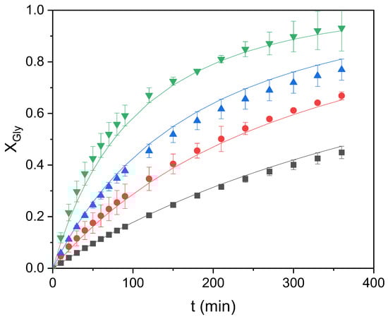 Once raw glycerol conversions were estimated for all of the runs, Origin 2021 software was applied to smooth the data through interpolation with hyperbolic functions. Smoothing allows for random experimental error elimination, providing corrected values of glycerol conversion that were the data used for kinetic modeling.