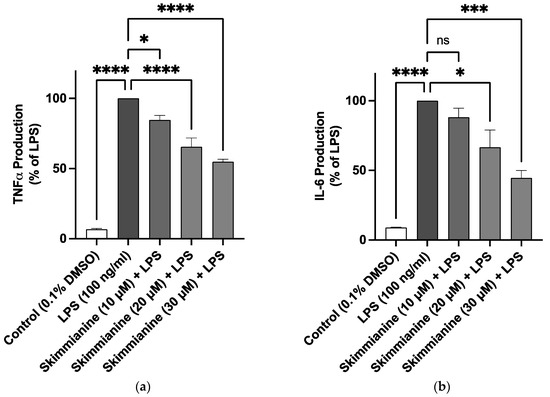 Skimmianine decreased TNFα and IL-6 production in BV-2 microglia cells stimulated with LPS. BV-2 cells were treated with or without skimmianine (10, 20 and 30 µM) and then stimulated with LPS (100 ng/mL) for 24 h. TNFα (a) and IL-6 (b) levels in cell culture supernatants were analysed using mouse ELISA kits. Values are mean ± SEM of at least three independent experiments. A statistical analysis was carried out using a one-way ANOVA with a post hoc Dunnett’s test. ns (not significant at p < 0.05); * p < 0.05; *** p < 0.001, **** p < 0.0001 in comparison with LPS stimulation.
