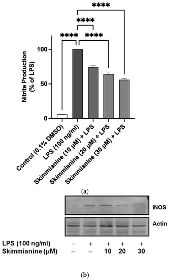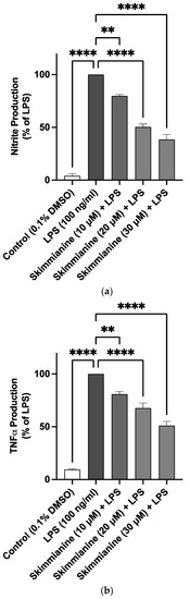 A significant (p < 0.0001) 16.6-fold increase in the levels of nitrite was observed following the stimulation of BV-2 cells with LPS (100 ng/mL) in comparison with unstimulated cells. Pre-treatment with skimmianine (10, 20 and 30 µM) prior to LPS stimulation resulted in a significant (p < 0.0001) reduction in nitrite production (Figure 4a).