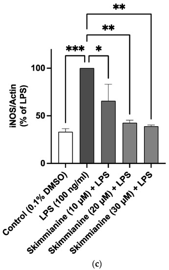 Skimmianine suppressed nitric oxide (NO) release (a) and inducible nitric oxide (iNOS) protein expression (b,c) in LPS-stimulated BV-2 cells. Cells were pre-treated with skimmianine (10, 20 and 30 µM) 30 min prior to stimulation with LPS (100 ng/mL) for 24 h. Cell culture supernatants were analysed for nitrite using the Griess assay, while western blotting was used to analyse iNOS protein expression in cell lysates. Values are mean ± SEM of at least three independent experiments. A statistical analysis was carried out using a one-way ANOVA with a post hoc Dunnett’s test. * p < 0.05; ** p < 0.01; *** p < 0.001; **** p < 0.0001 in comparison with LPS stimulation.