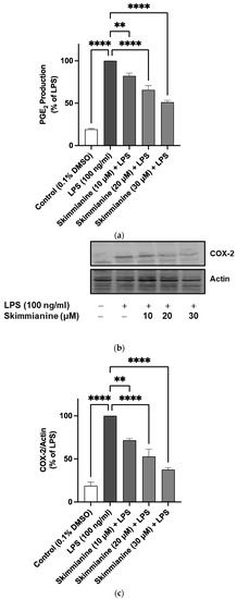 LPS also induced a ~5.3-fold increase (p < 0.0001) in the expression of COX-2 protein. When cells were pre-treated with skimmianine (10, 20 and 30 µM), significant (p < 0.001) reductions in COX-2 protein expression were observed (Figure 5b,c).
