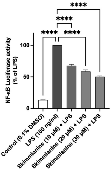 Based on the outcome of experiments showing the inhibition of neuroinflammation by skimmianine through the reduction in the production of inflammatory mediators, its effect on NF-κB-mediated gene expression was evaluated. To achieve this, a plasmid construct bearing a luciferase reporter gene under the regulation of NF-κB was transiently transfected into BV-2 cells. The stimulation of transfected cells with LPS resulted in significant (p < 0.0001) activation of the NF-κB-driven luciferase activity, which was significantly (p < 0.0001) inhibited by skimmianine (10, 20 and 30 μM), as shown in Figure 6.
