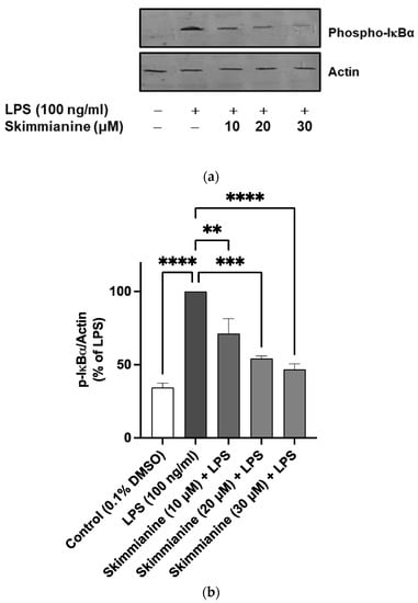 Encouraged by the marked inhibition of NF-κB-mediated gene transcription by skimmianine, the following experiments focused on whether skimmianine could affect the critical steps in the activation cascade of NF-κB. The results in Figure 7 show a significant (p < 0.0001) increase in the expression of phospho-IκBα following the stimulation of BV-2 cells with LPS (100 ng/mL). When cells were pre-treated with skimmianine (10, 20 and 30 μM), a significant and concentration-dependent reduction in protein expression of phospho-IκBα was observed.